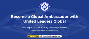 The Global Ambassador Program at United Leaders Global (ULG) is a prestigious opportunity for passionate changemakers to represent United Leaders Global on an international stage. As a United Leaders Global Ambassador, you’ll champion inclusive, ethical, and transformative leadership, while building bridges among young leaders and expanding access to global opportunities.